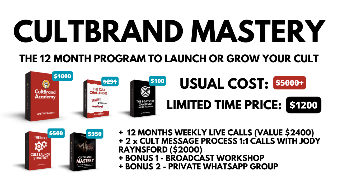 + 10 Weekly Live Group Calls with Jody Raynsford to help you at every stage of your cult building journey